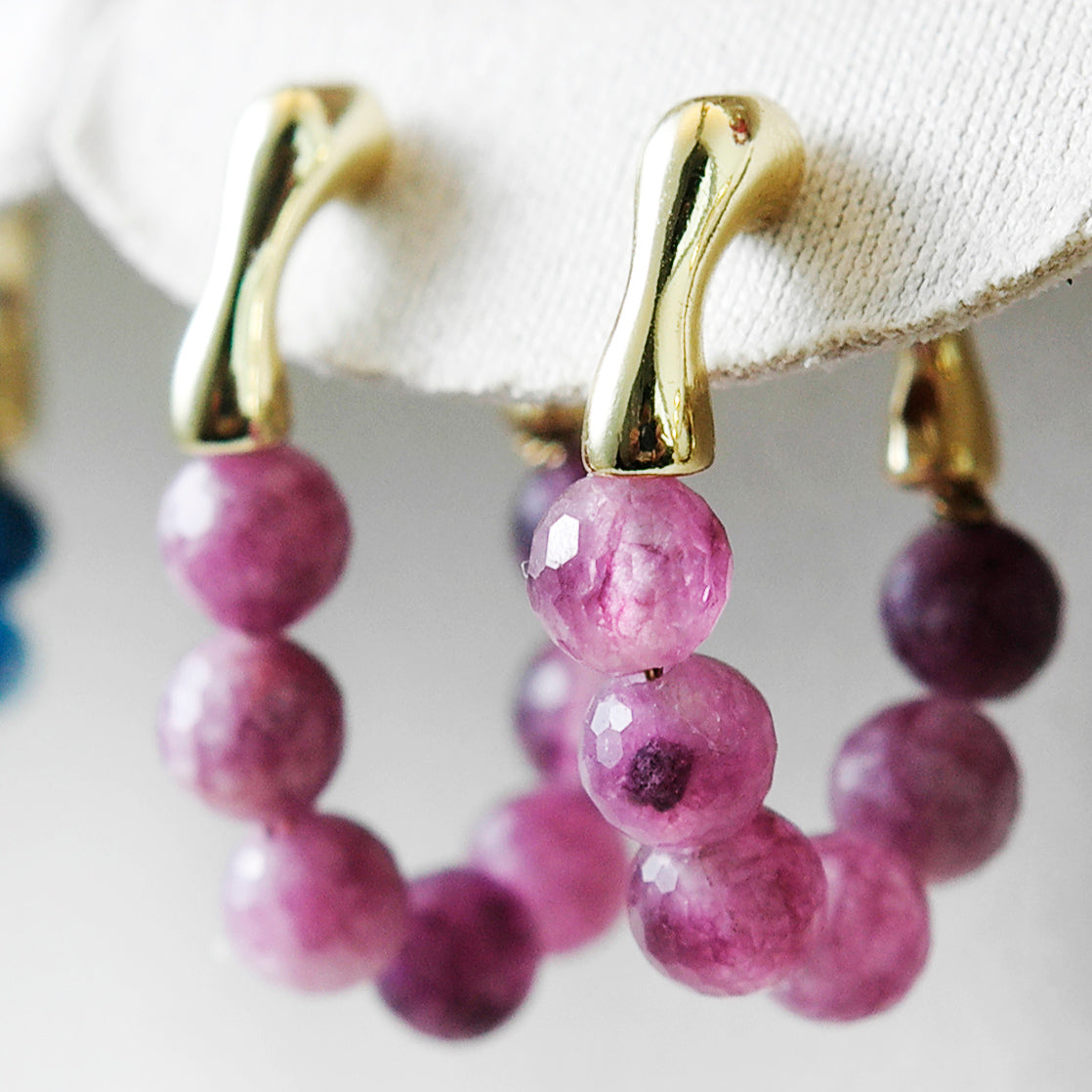 The gemstones are around 4–5mm in size, each one unique with its own natural inclusions and texture, making every pair one of a kind. Set on 18K gold-plated copper hoops, these earrings blend soft color and gentle shine with a modern handcrafted touch.