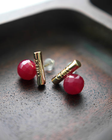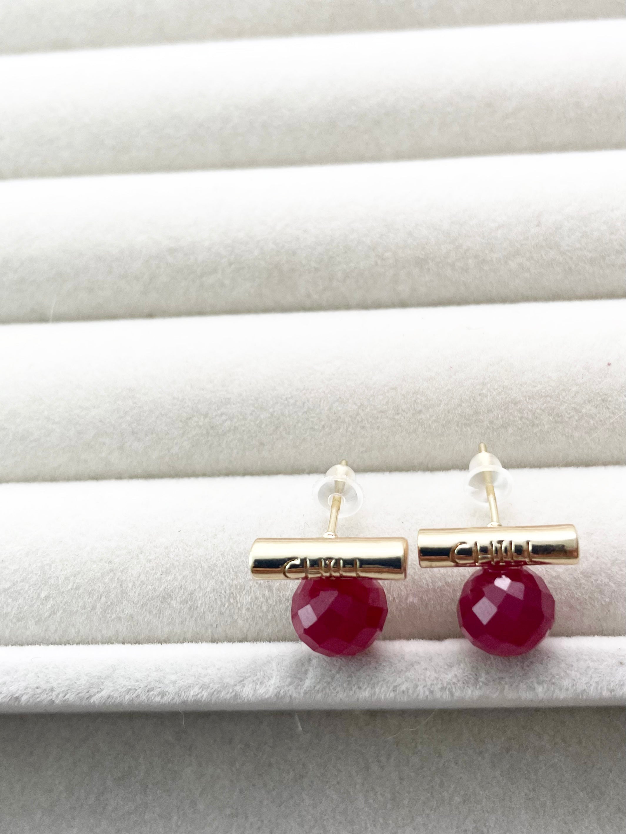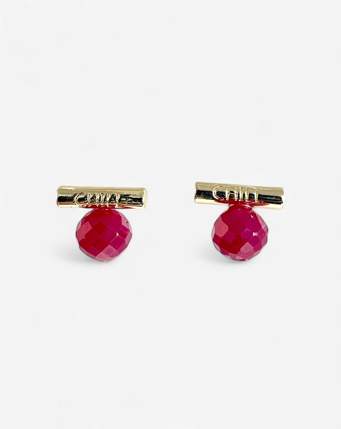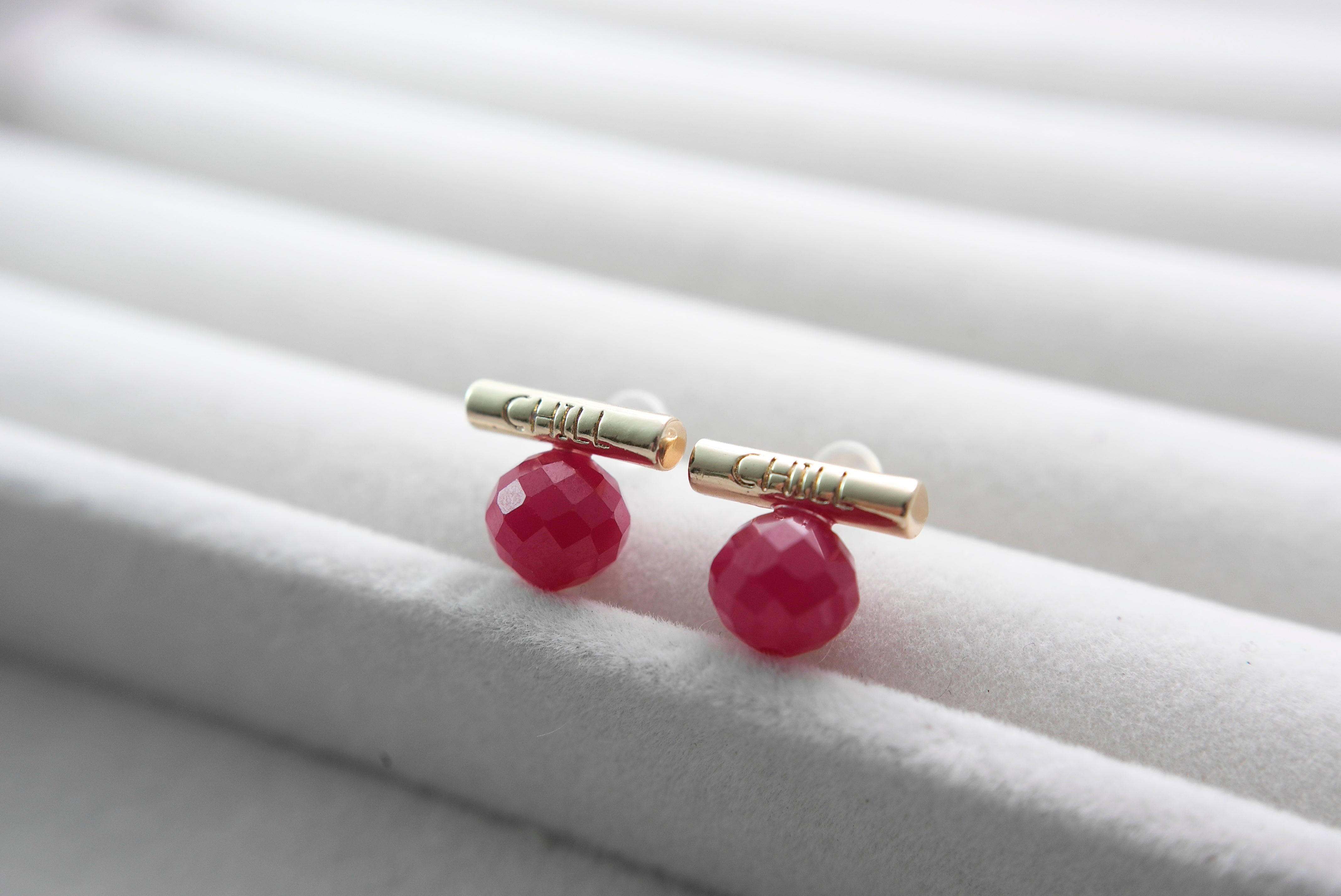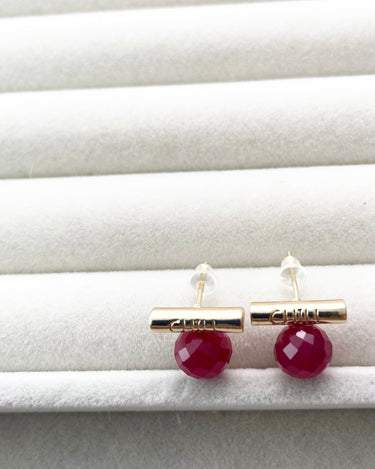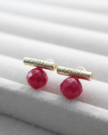 These faceted lab-grown rubies are full of vibrant color and energy, symbolizing strength, passion, and deep affection. Each gemstone is individually handcrafted and paired with a minimalist "CHILL" bar in your choice of silver or gold tone.