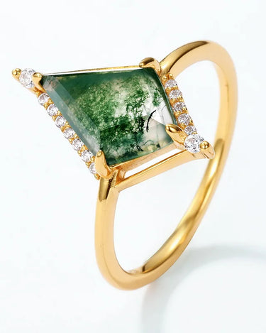 Add a touch of elegance to any outfit with this stunning moissanite ring. Made with high-quality 925 sterling silver, this ring features a kite cut moss agate stone that measures 8x12 MM. With the option to choose from 10K, 14K, or 18K gold plating, this ring is versatile and perfect for any occasion. Not only is the ring lightweight at just 3 g, but it also boasts a natural moss agate stone, making it a unique and beautiful piece. Elevate your jewelry collection with this one-of-a-kind engagement ring.