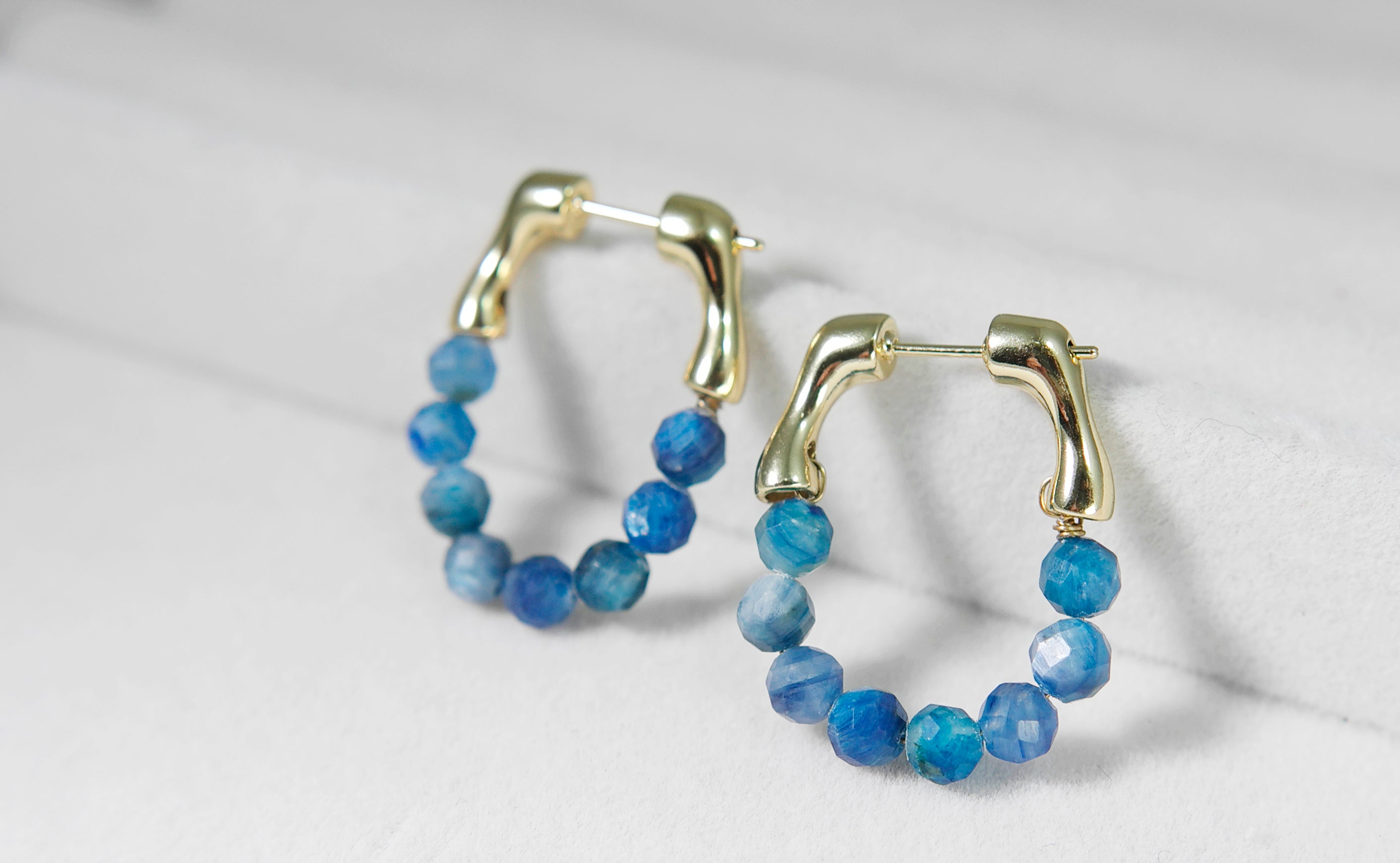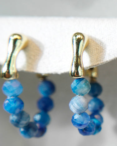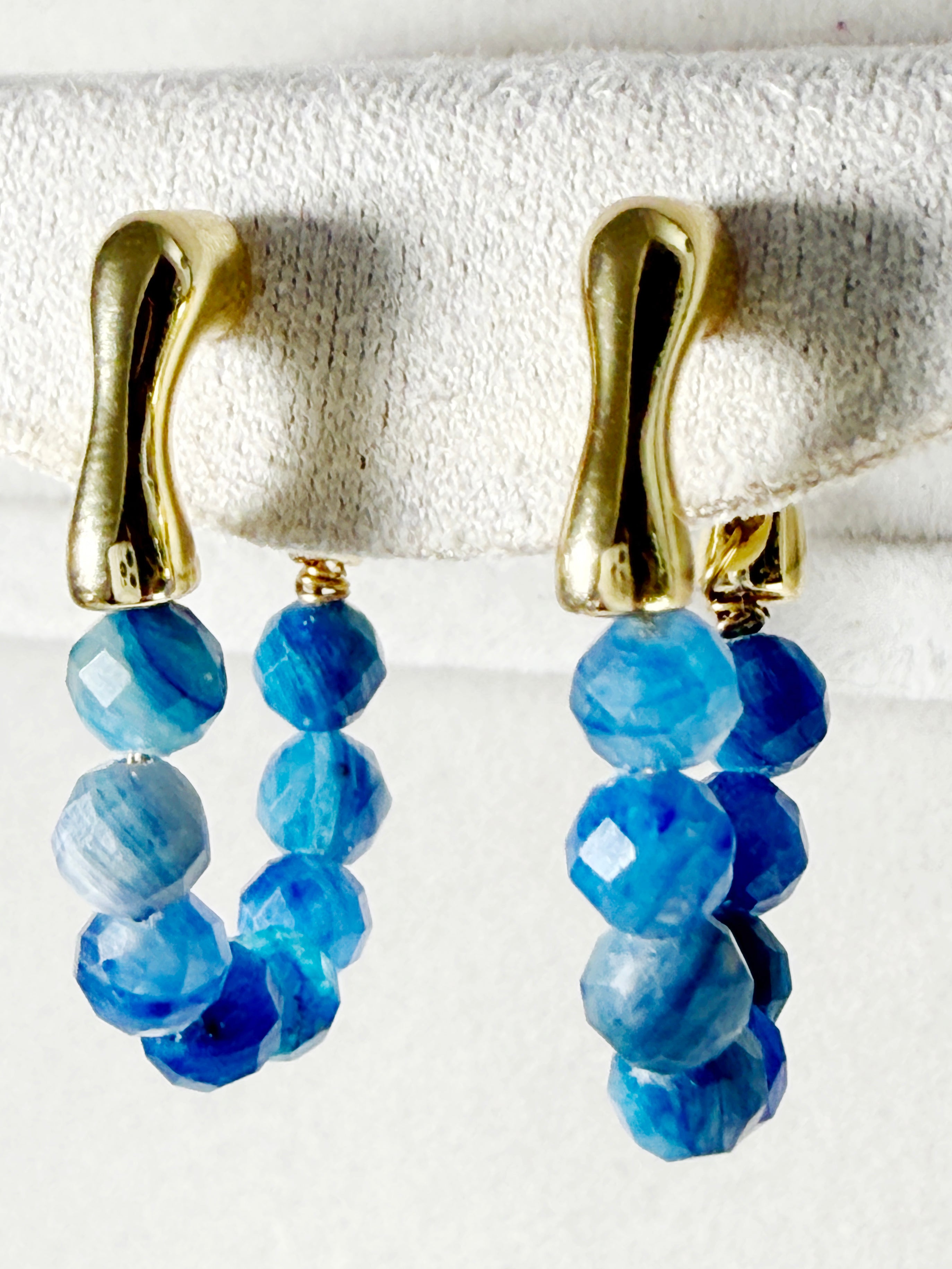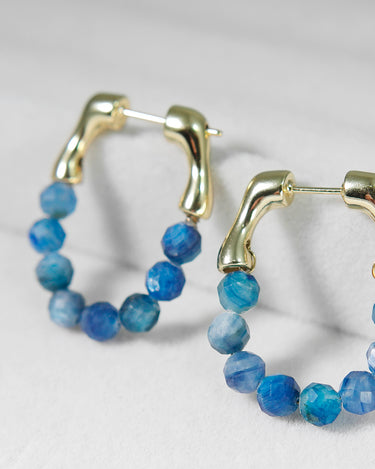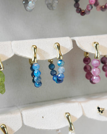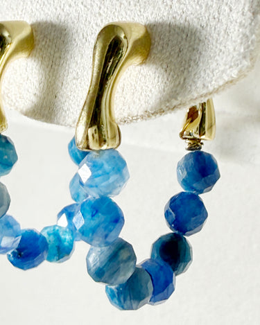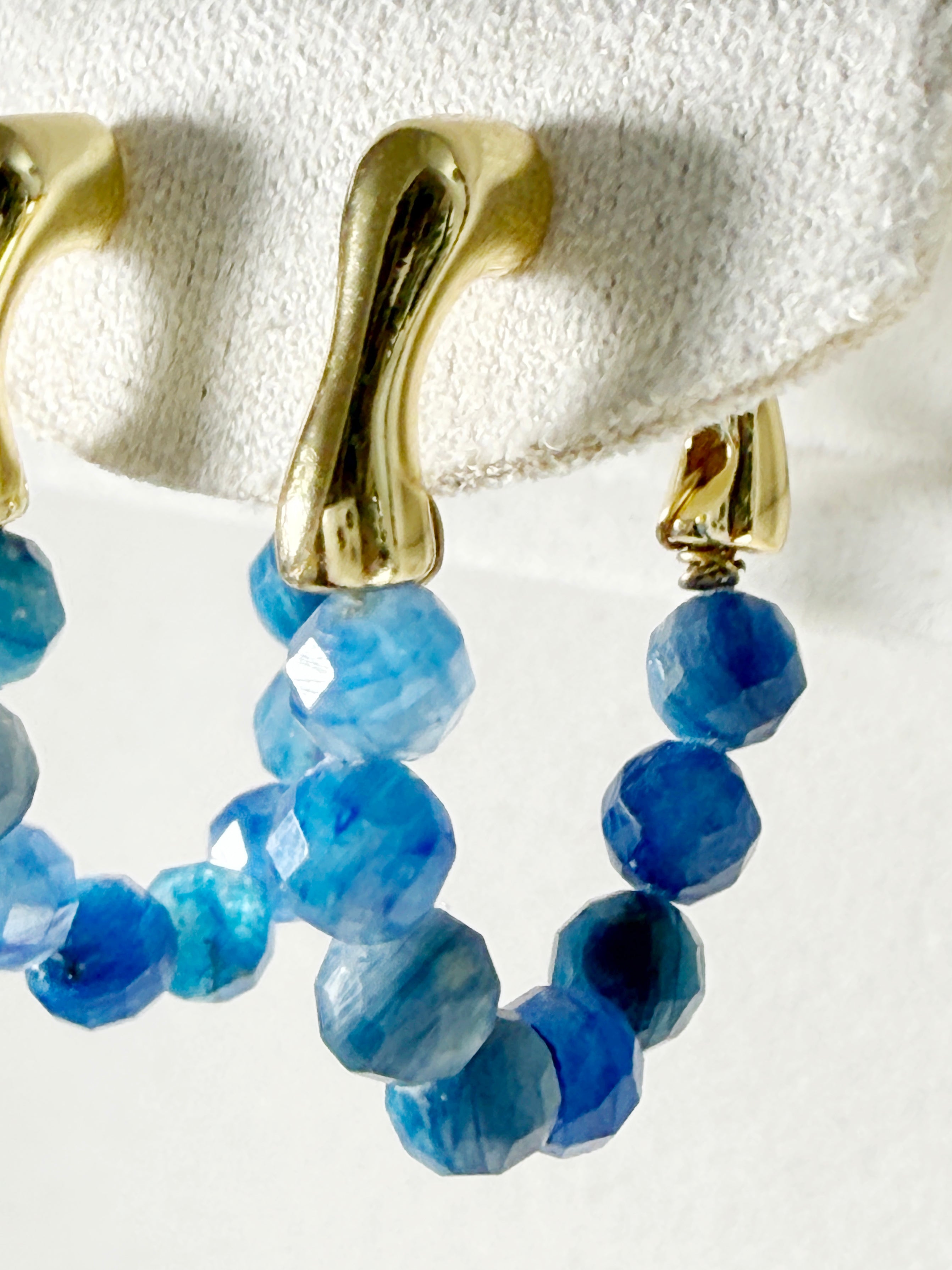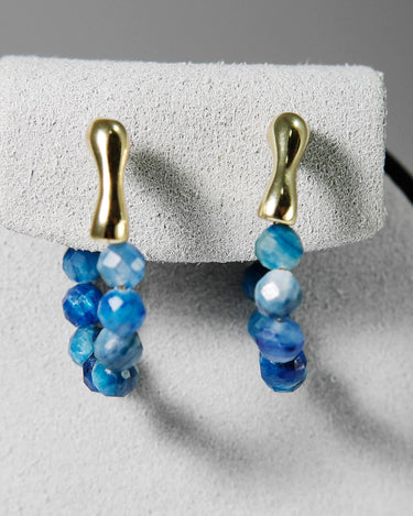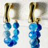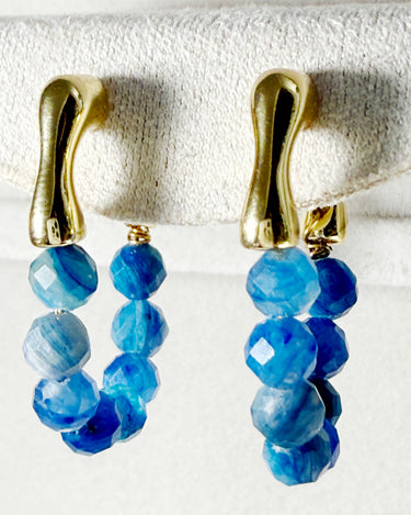 The beads hang from a smooth gold-plated brass hoop, creating a sparkling, ocean-blue curve when worn. Although the sapphires are not highly transparent, their natural variation gives the earrings a raw, organic beauty.