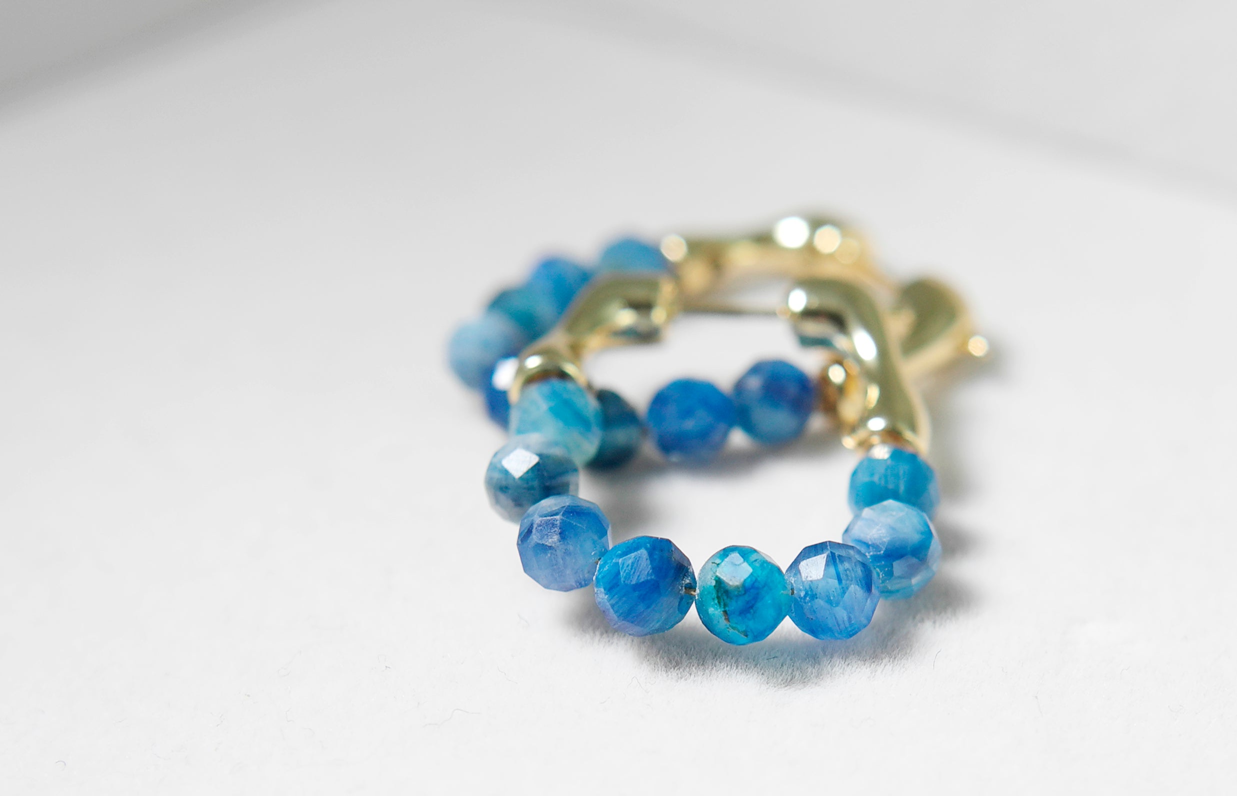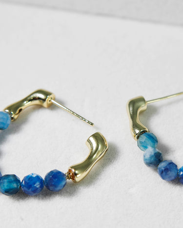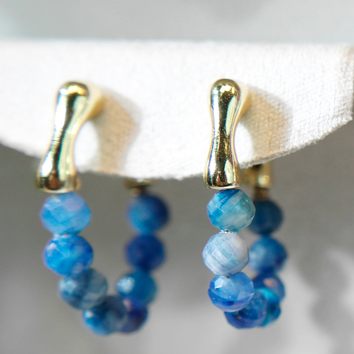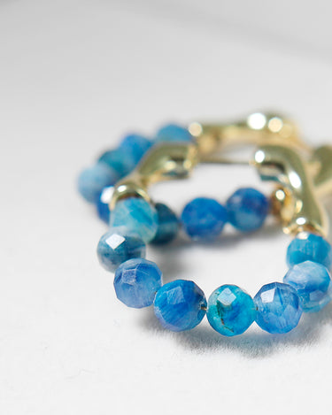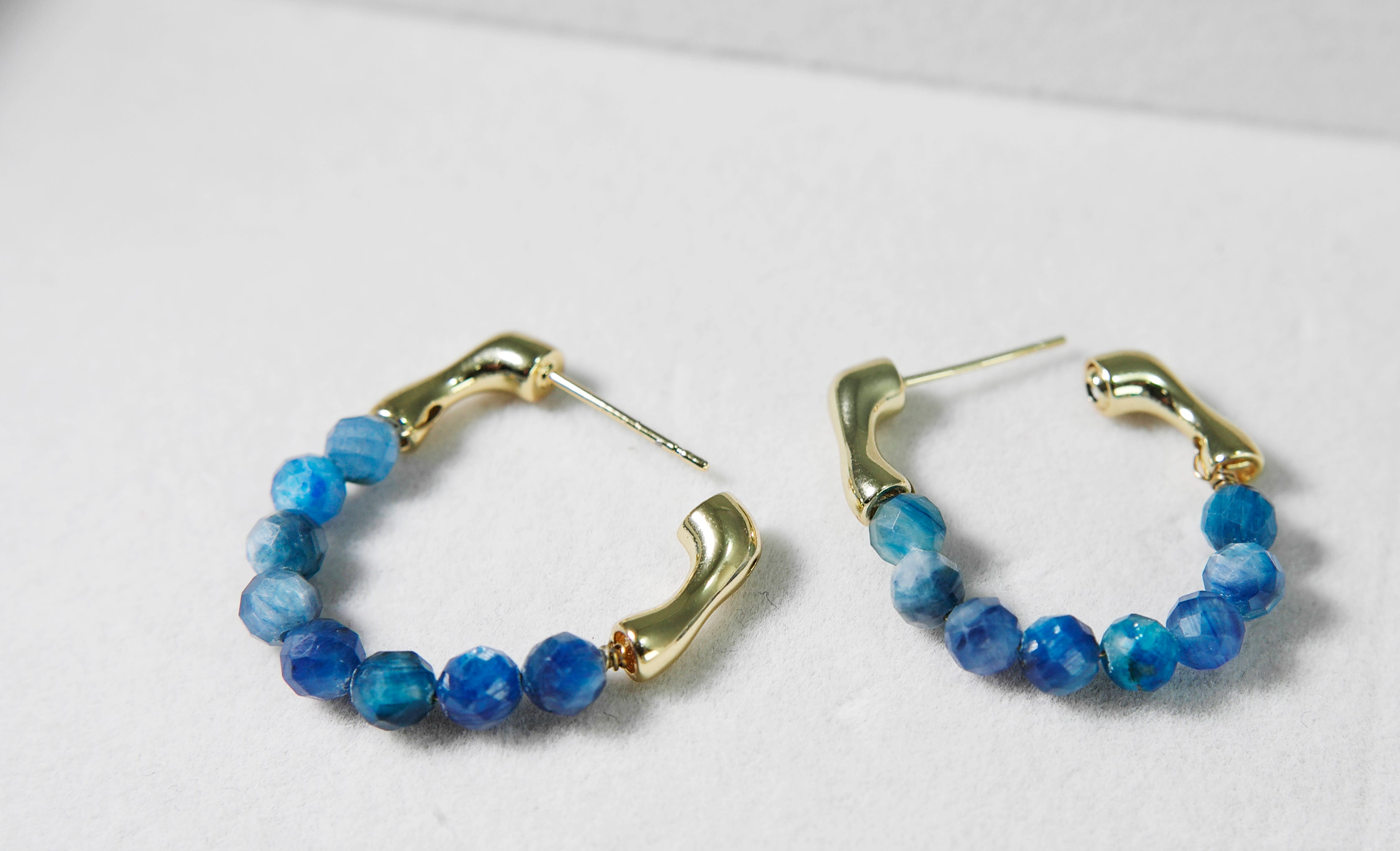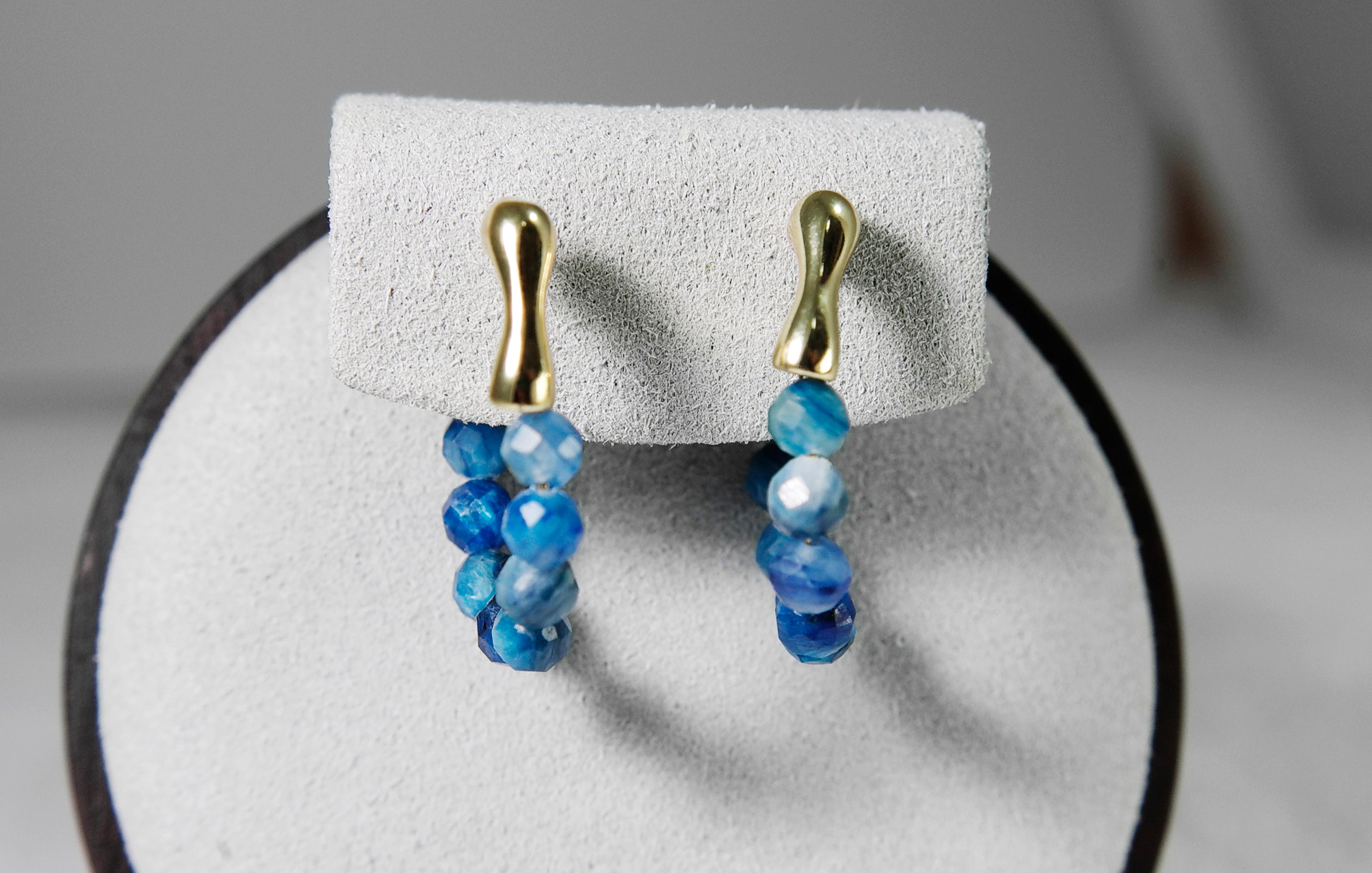 The beads hang from a smooth gold-plated brass hoop, creating a sparkling, ocean-blue curve when worn. Although the sapphires are not highly transparent, their natural variation gives the earrings a raw, organic beauty.